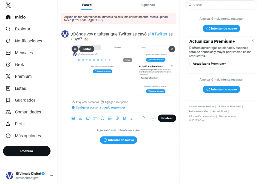 La caída de la plataforma es prácticamente total, ya que no se puede acceder al feed, ver notificaciones, hashtags o publicar algo: en resumen, no se puede interactuar en lo absoluto con la cronología y otras funciones de X.